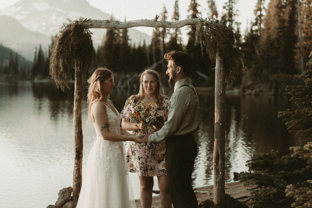 Even though Sparks Lake is a popular destination, Zac + Nat wanted their ceremony to feel private and intimate. So, we loaded up kayaks and canoes and paddled about 30 minutes across the lake to their hidden campsite. Waiting for us was a simple, handmade arbor built by Zac and his military buddy—proof again that their day was all about love, friendship, and intention.