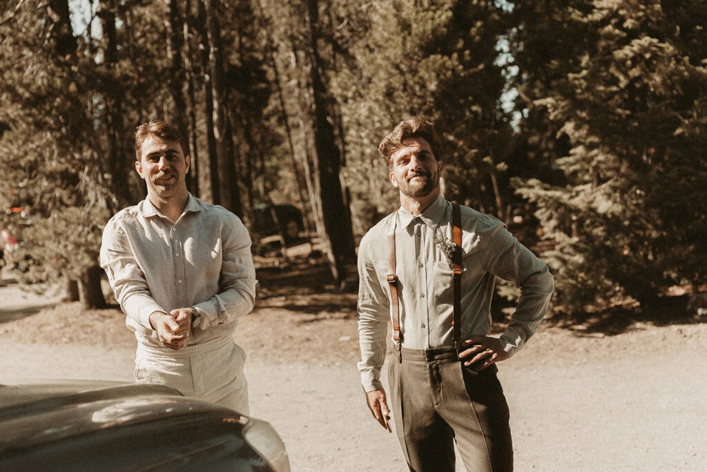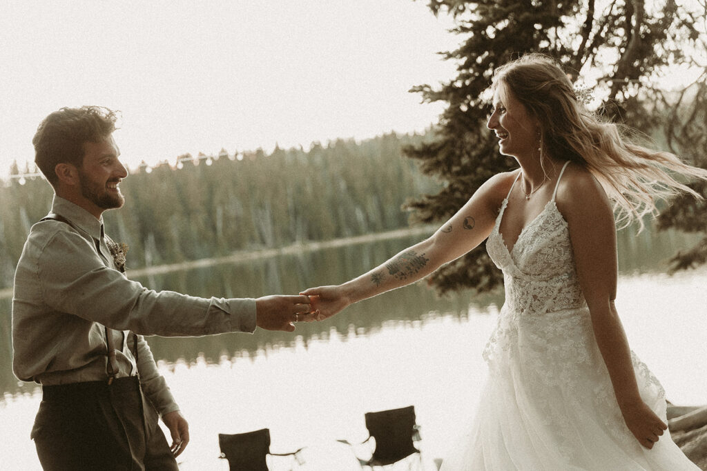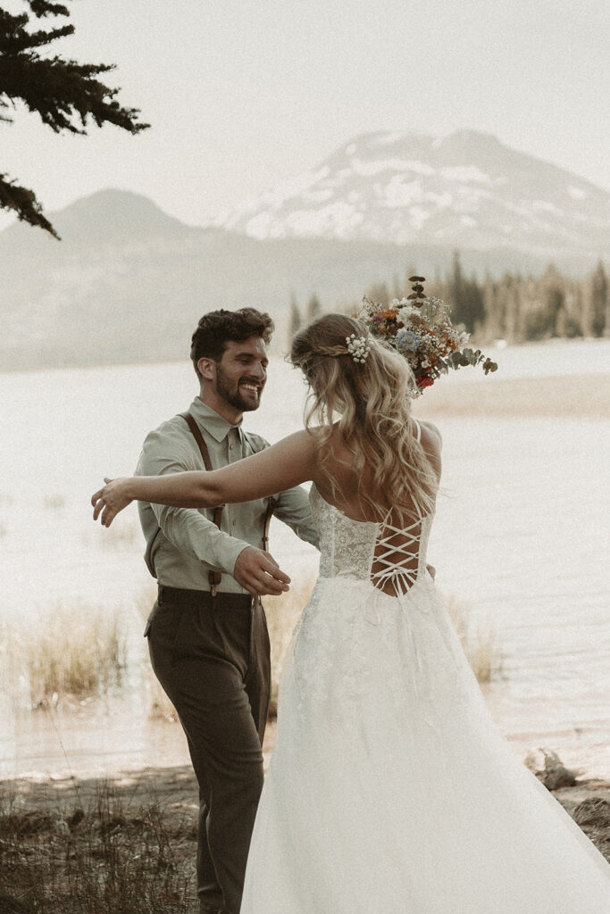 Instead of hotel rooms or a big wedding venue, Zac + Nat chose something way more “them.” They camped out with their friends along Sparks Lake and got ready right there at their vehicles—wind-blown hair, mountain air, and all the laid-back vibes. It set the tone for the day: no pressure, no production, just them and the people who mattered most.